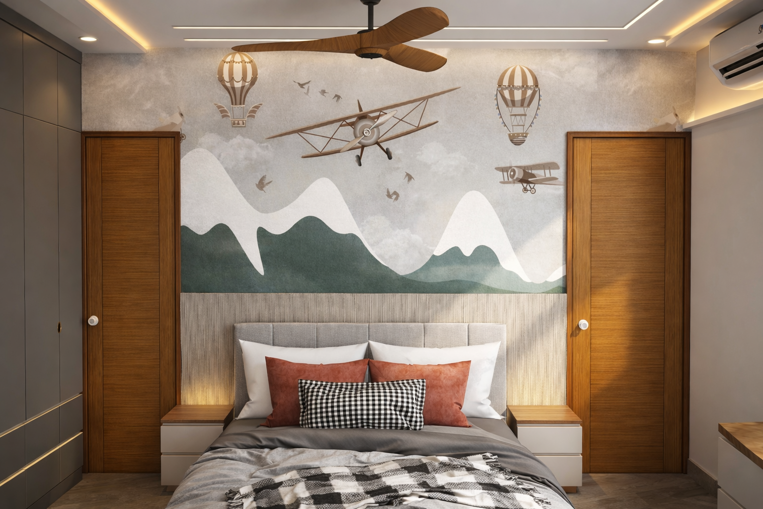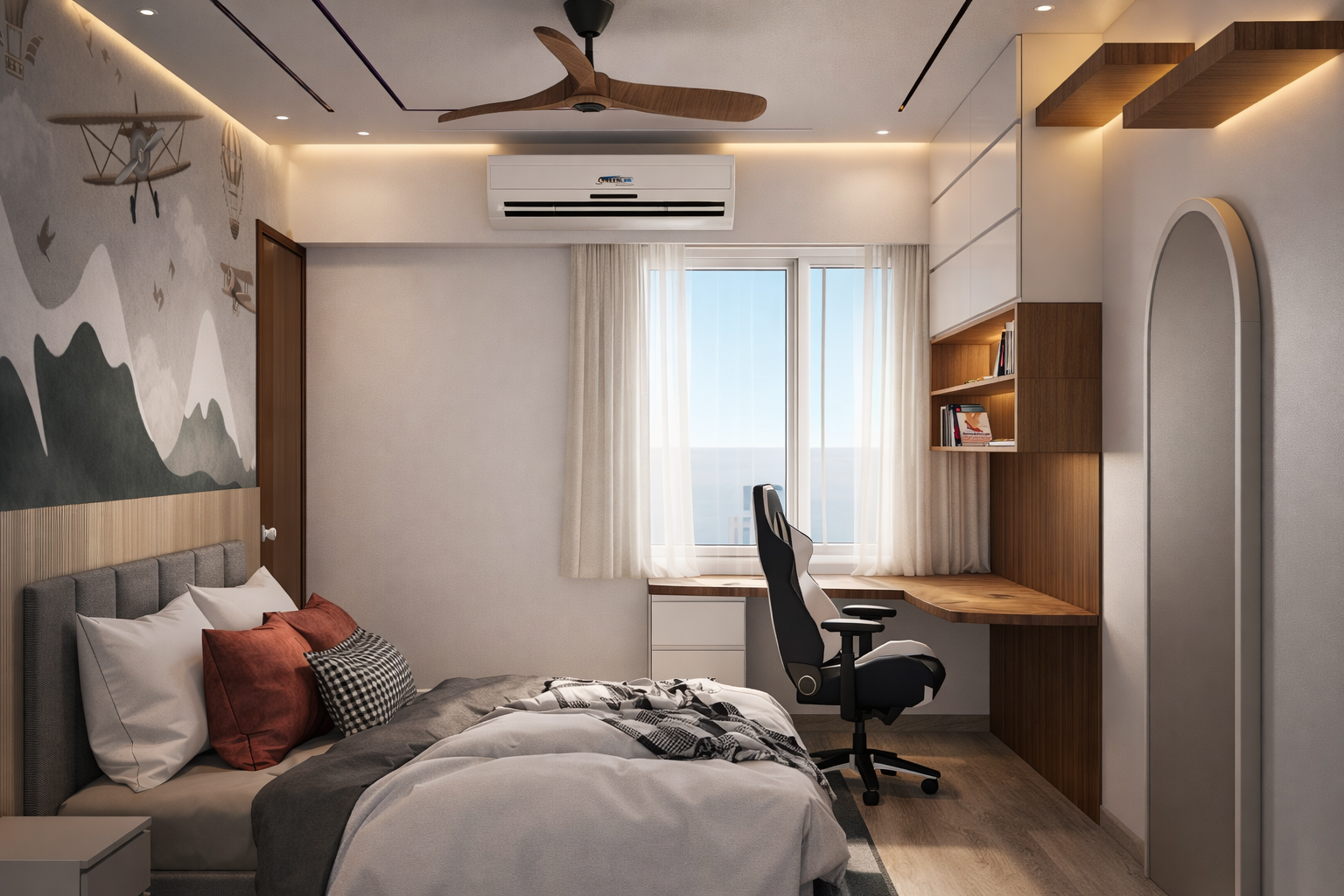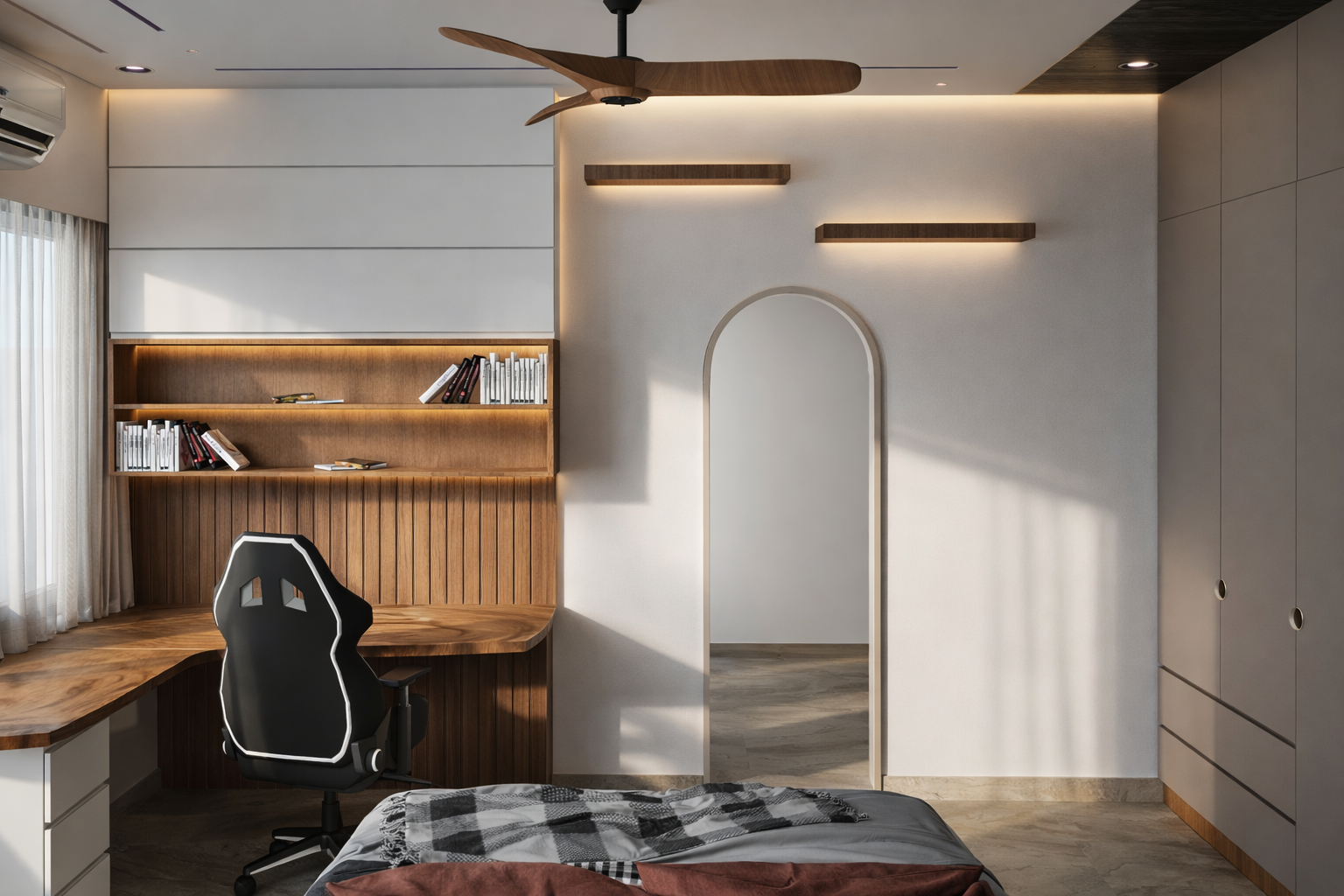 This living room design focuses on minimal aesthetics, clean lines, and balanced material textures. Neutral tones and subtle lighting create a calm and sophisticated interior environment.